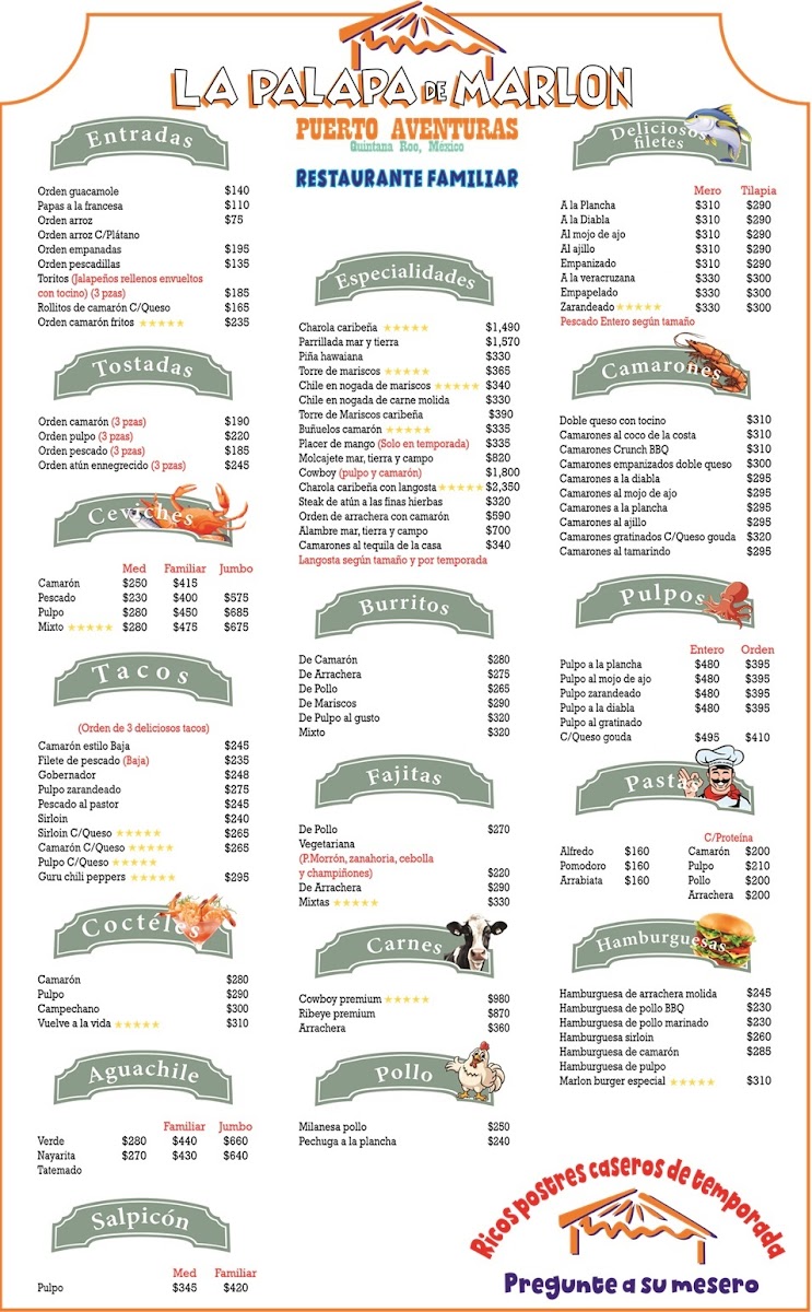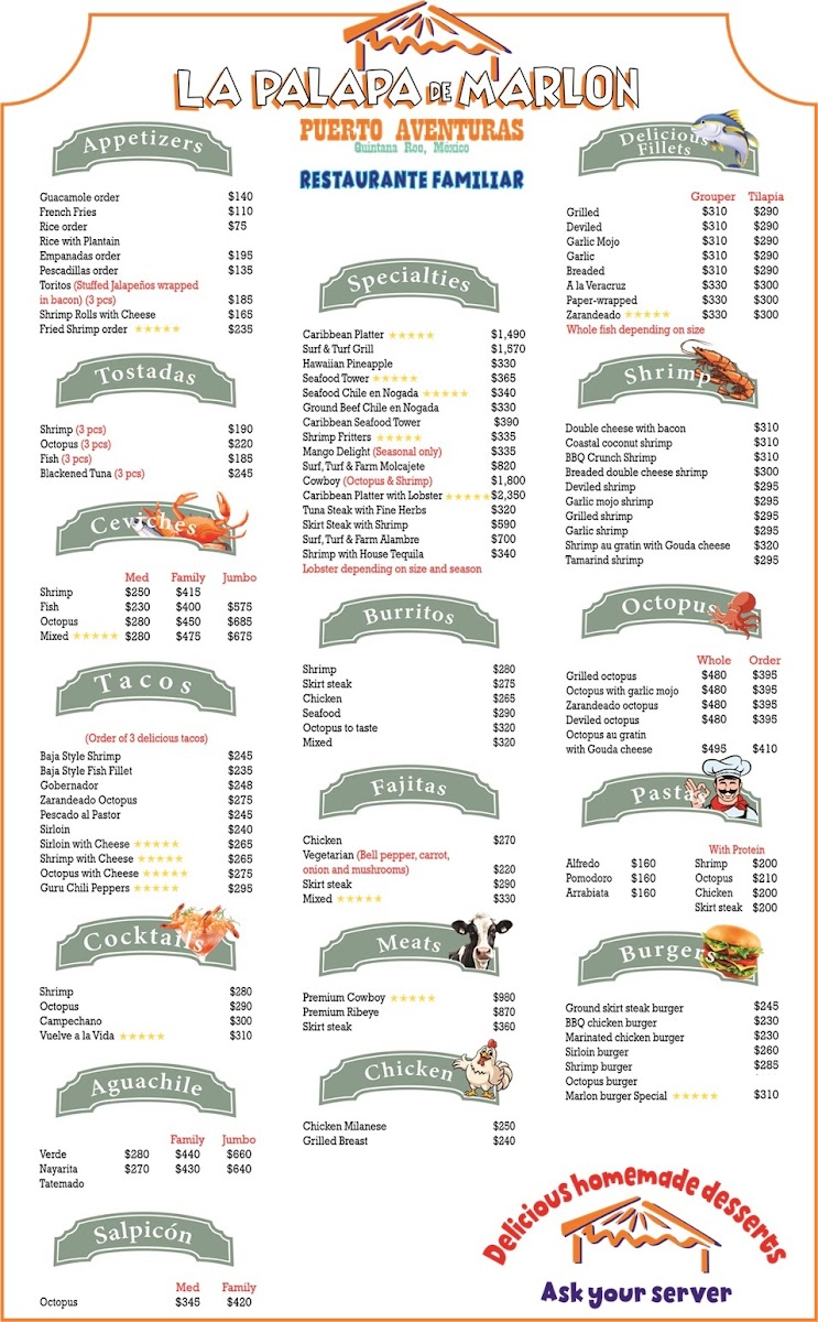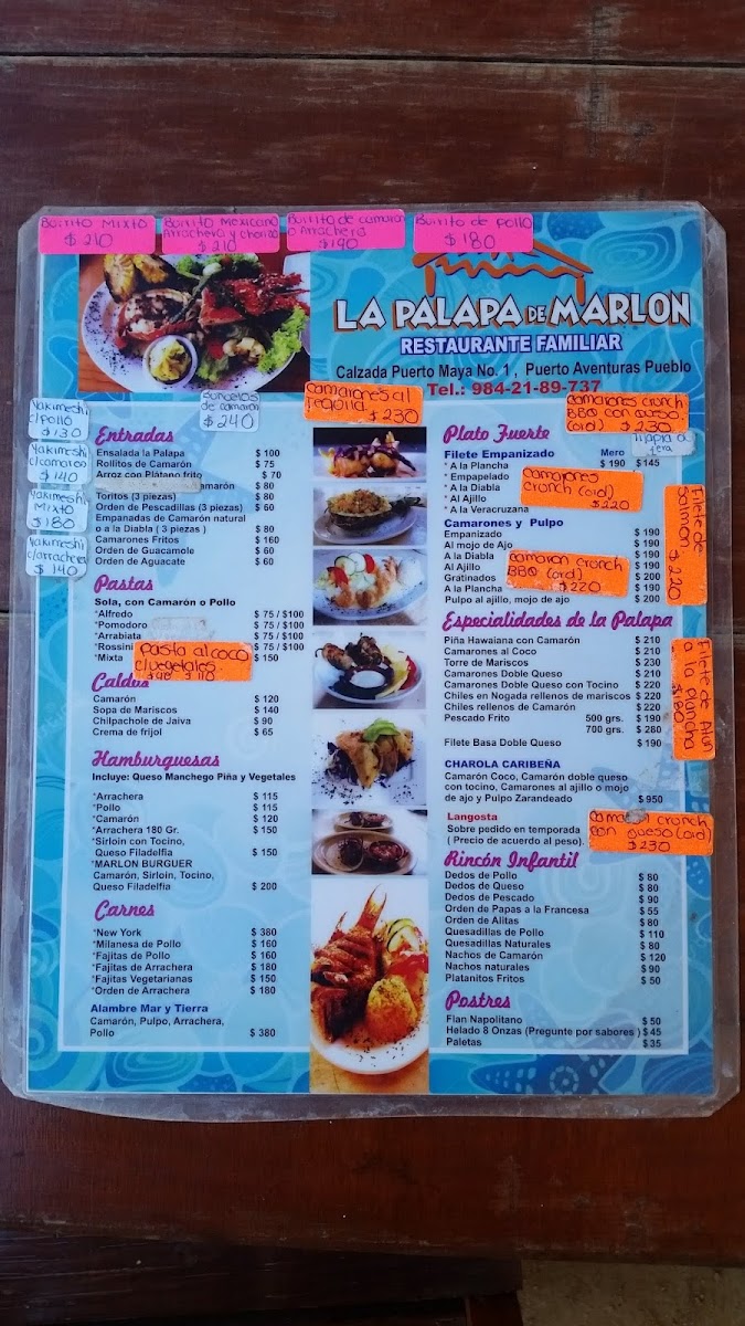 Welcome to LA PALAPA DE MARLON, a hidden gem nestled in Puerto Aventuras, Mexico. This culinary paradise is celebrated for its vibrant menu, which beautifully showcases the flavors of the sea. Guests rave about the Fish Tacos Al Pastor, touted as the best tacos many have ever encountered. The large portions and attentive service set a welcoming tone for a delightful dining experience.